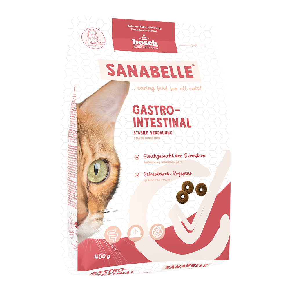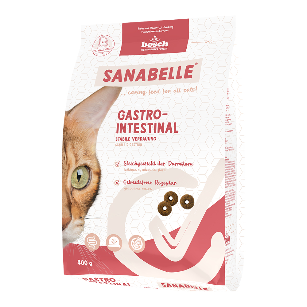 Sanabelle Gastrointestinal bylo speciálně vyvinuto pro optimální podporu citlivého trávicího systému nutričně citlivých koček. Obzvláště vysoká stravitelnost a zvýšená energetická hustota znatelně ulevují gastrointestinálnímu traktu a podporují rychlou regeneraci – ideální po veterinární léčbě nebo při chronických zažívacích potížích. ---