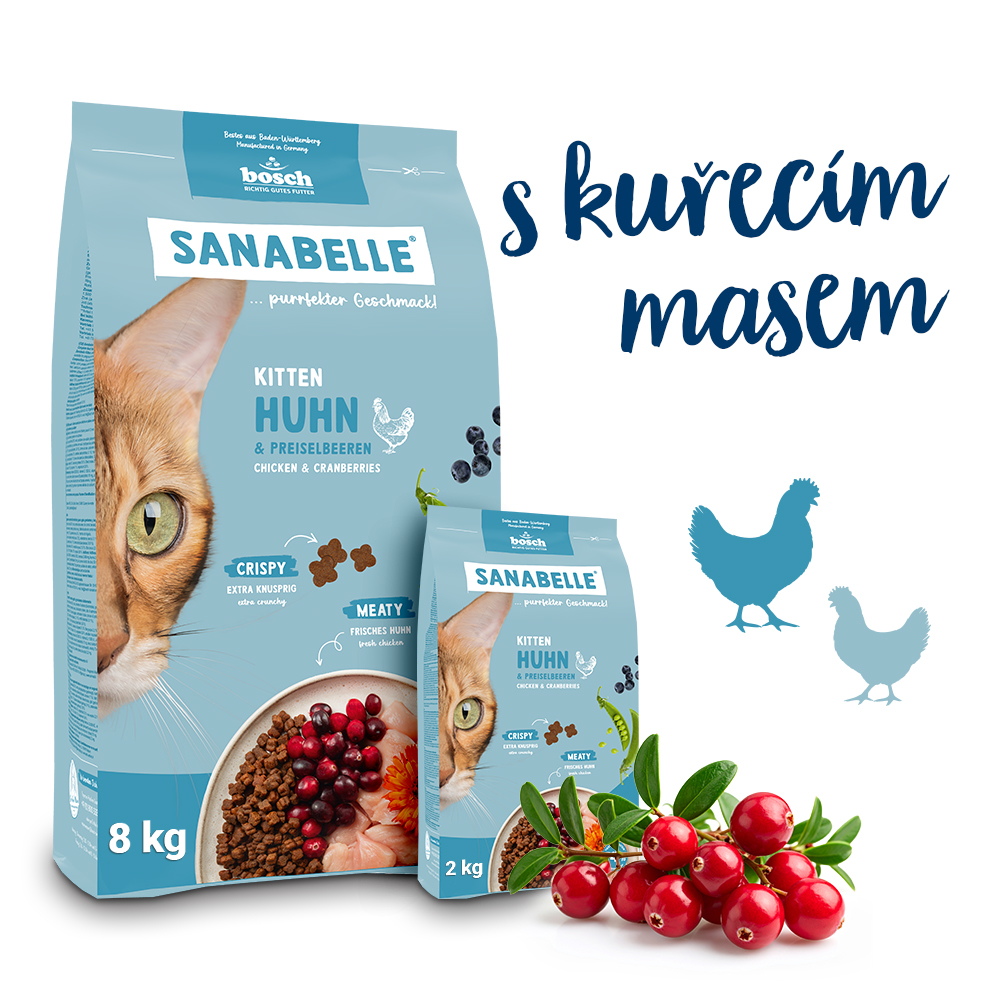 Sanabelle Kitten s kuracím mäsom a kuracím mäsom mačiatka do 12 mesiacov veku. Počas tejto intenzívnej fázy rastu je obzvlášť dôležitá výživná, vyvážená a ľahko stráviteľná strava – pre optimálny vývoj kostí, svalov, orgánov a imunitného systému.