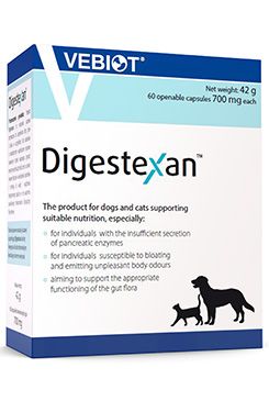 Výživový doplnok pre psov a mačky vo forme ľahko podávateľných kapsúl, vytvorený na podporu fyziologických tráviacich procesov vášho štvornohého priateľa. obsahuje enzýmy, ktoré podporujú činnosť pankreasupodporuje tráviace procesypohodlné, otvárateľné kapsule Ako Digestexan funguje?Vďaka svojmu unikátnemu trojitému zloženiu Digestexan komplexne podporuje tráviaci systém psov a mačiek:podporuje sekrečné funkcie pankreasupodporuje fyziologicky použiť Digestexan?DIGESTEXAN je ideálny doplnok stravy pre psov a mačky všetkých vekových kategórií, najmä pre tých, ktorí potrebujú:podpora sekrečných funkcií slinivky brušnejpodporujú správnu funkciu črevnej flórypodpora trávenia Zloženie:vedľajší produkt výroby enzýmov Aspergillus nigerom produkt vyrábaný Aspergillus oryzaem 16,64%, materiály minerálneho pôvodu 7,86%, kvasinky Saccharomyces 4,29%, horečnaté soli kyseliny stearovej 1,1%.Doplnkové látky:Technologické doplnkové látky: fruktooligosacharidy (FOS)kg 14,3 g/kg (plnidlo). Ako používať Digestexan? Spôsob podania: Kapsulu DIGESTEXAN možno zvieraťu podať celú, priamo do papule alebo schovanú, napríklad v maškrte. Kapsulu môžete tiež otvoriť a zmiešať jej obsah s obľúbeným krmivom alebo vodou a prázdnu šupku vyhodiť. Balenie obsahuje 60 otvárateľných kapsúl. Obsah kapsule je bez chuti a zápachu. Denná dávka Telesná hmotnosť psa/mačky 1 kapsula 1 2 kapsule 11 kg / 20 kg 3 kapsule 21 kg / 35 kg 4 kapsule nad 35 kg