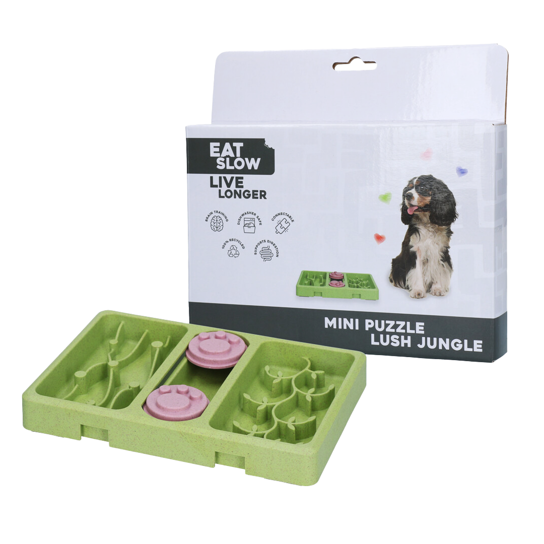 Malé puzzle, veľa zábavy. Jedny Mini Puzzle nestačia. Vytvor si skladačku zo štyroch rôznych hlavolamov. Vďaka svojej drobnej veľkosti sú jednotlivé hlavolamy Mini Puzzle vhodné pre toy a menšie plemená psov alebo šteňatá. Na bočných stranách hlavolamov tejto kolekcie je zasúvací kaštieľ, vďaka ktorému jednotlivé hlavolamy jednoducho spojíš a vytvoríš tak väčšie puzzle aj pre väčších maznáčikov. Hlavolamy môžeš spájať v rôznom poradí a hru tak obmieňať. Vytvor si veľký hlavolam zo všetkých štyroch druhov, meň a kombinuj, hra bude zakaždým iná! Motivuj svojho psa a stimuluj jeho myseľ. Eat Slow Live Longer hlavolam zabaví vášho psíka na dostatočne dlhú dobu a odvedie jeho pozornosť od devastujúcich činností z nudy. Navyše tým môžeš posilniť puto so svojim psíkom, pri spoločnom riešení "záhady" ako dostať von všetky maškrty. Výhody týchto hlavolamov sú okrem iného aj to, že znižujú úzkosť a stres, zlepšujú pamäť a schopnosť riešiť problémy. Do hlavolamu môžeš dať časť kŕmnej dávky alebo ho využiť na spomalenie jedenia opakovaným naplnením. Pomalé jedenie napomáha lepšiemu tráveniu a pocitu sýtosti, znižuje nadúvanie, loudenie a uspokojuje koristnícky pud. Eat Slow Live Longer sú vyrobené z recyklovaného plastu bezpečného pre potraviny v kombinácii s drevenými vláknami, táto nová výrobná metóda je na svete jedinečná a robí tieto hlavolamy ešte odolnejšie a pevnejšie a zároveň ekologická. Na spodnej strane sú hlavolamy protišmykové, takže vašim psíkom nebudú utekať pri zbesilom hľadaní schovanej odmeny. Mini Puzzle Crazy River (šialená rieka): Zelený hlavolam s červenou turbínou uprostred, a práve tam schovej maškrty alebo menšie granule. Keď psík turbínu roztočí ňufákom alebo packou na jednu či druhú stranu, dobroty sa presunú do bočných častí s vlnkami a kockami, ktoré mu získanie odmeny pekne sťažia. Skvelá zábava aj mentálna výzva v jednom! (veľkosť 13 x 19 cm, výška 4cm) Mini Puzzle Lush Jungle (bujná džungľa): V strednej časti zeleného hlavolamu Lush Jungle nájdeš ružové kolieska s labkami, ktoré možno posúvať. Úlohou psíka je prísť na to, ako ich posunúť, aby odhalil ukryté dobroty. Bočné časti sú prepletené „liánami“ a „bujnými trávami“, ktoré mu cestu k maškrtám skomplikujú, takže žiadna nuda, ale poriadna džungľa pre psiu hlavičku! (veľkosť 13 x 19 cm, výška 2cm) Mini Puzzle Rainy Day (daždivý deň): Modrý hlavolam je rozdelený opäť na tri časti. V strede nájdete dva červené vyberateľné kolíky, ktoré môžete naplniť maškrty cez otvor uprostred. Psík musí kolík zdvihnúť alebo odstrčiť, aby sa dostal k odmene schovanej pod ním. Bočné časti pripomínajú spomaľovacie misky. Jedna je plná mrakov a kvapiek dažďa, druhá má prúžky a výčnelky, ktoré sťažujú získanie dobrôt. Ideálny hlavolam pre chytré ňufáky a dlhé daždivé dni! (veľkosť 13 x 19 cm, výška s kolíkmi 5cm) Mini Puzzle Starry Night (hviezdna noc): Krásny modrý hlavolam pre pokročilejších lúštiteľov ponúkne hneď tri rôzne výzvy! Stredová časť funguje ako spomaľovacia miska s výstupkami v tvare mesiaca a hviezd. Na jednej strane čakajú ružové kolieska s labkami. Psík ich môže posúvať, ale nie vybrať, a musí prísť na to, ako posunutím odhaliť ukryté dobroty. Druhá strana skrýva šedé zatváracie priehradky, ktoré psík musí otvoriť, aby sa dostal k maškrtám. Vďaka malým dierkam vo viečkach môže cítiť vôňu dobrôt alebo mu úlohu trochu uľahčíte, keď cez dierku pretiahnete špagát s uzlíkom. Skvelá zábava, ktorá potrápi psiu hlavičku aj labky! (veľkosť 13 x 19 cm, výška 2cm) Spojením všetkých štyroch hlavolamov vytvoríte parádne variabilné ihrisko plné rozmanitých schovávačiek a výziev pre psiu hlavičku. A ak si váš maznáčik zamiluje jeden konkrétny hlavolam, pokojne ho kúpte viackrát. V zostave ho môžete použiť opakovane a vytvoriť si hru presne podľa svojho gusta! Výhody hlavolamov Eat Slow Live Longer Mini: - možnosť napojenia a vytvorenia variácií - ideálne pre menšie plemená psov a šteňatá - stimulujú myseľ psa - znižujú úzkosť a#stres #13 - zlepšujú pamäť a schopnosť riešiť problémy - vyrobené z recyklovaného plastu s drevenými vláknami nezávadnými pre potraviny - možno umyť v ruke s prostriedkom na umývanie riadu - vďaka jedinečnému procesu výroby sú odolnejšie - protišmykové prvky Hlavolam Mini: - veľkosť 13 x 19cm - výška 2 - 5cm Upozornenie: Hračka je určená pre hru pod dozorom. Pri poškodení hračku odoberte a odstráňte malé časti, aby nedošlo k ich prehltnutiu. Vyberajte veľkosť a typ hračky podľa veľkosti a temperamentu svojho maznáčika. Výrobca / Značka: Eat Slow Live Longer Dovozca a distribútor pre SR: Rebel Dog sro Posledná aktualizácia: 2025/10