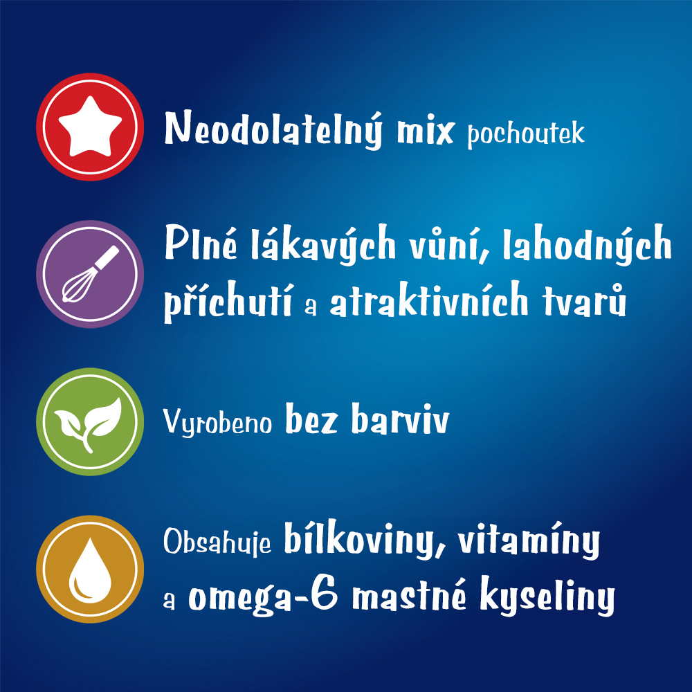 Užite si viac radostných a rozpustilých chvíľok s Vašou mačkou s novinkou Party Mix - obsahujúcou neodolateľný farebný mix mäsových pochúťok, ktoré sú plné lákavých vôní, lahodných chutí a príťažlivých textúr. Felix Party Mix prichádza s radom troch lahodných príchutiach: Original Mix (s príchuťou kurčaťa, pečene a morky); Ocean Mix (s príchuťou lososa, tresky a pstruha); Mixed Grill (s príchuťou hovädzieho, kurčaťa a lososa). A to nie je všetko! Felix Party Mix obsahuje bielkoviny, vitamíny a omega-6 mastné kyseliny a pomáha tak Vašej mačke žiť zdravý a šťastný život. Zloženie: mäso a vedľajšie výrobky živočíšneho pôvodu (35 %)*, obilniny, oleje a tuky, bielkovinové extrakty rastlinného pôvodu, minerálne látky, cukry, kvasnice, ryby a vedľajšie výrobky z rýb (* čo zodpovedá 50 % rehydratovaných, s min. 26 % mäsa, 0,5 % kurčaťa, 0,5 % pečene a 0,5 % morky)