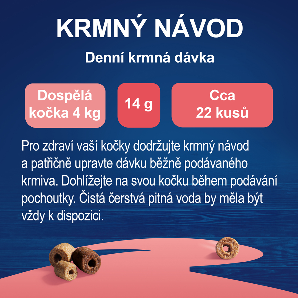 Kŕmny návod: Denná kŕmna dávka pre dospelú mačku 4 kg: 14 g alebo približne 23 kúskov. Čistá čerstvá pitná voda by mala byť vždy k dispozícii. Pre zdravie vašej mačky dodržujte kŕmny návod a patrične upr.