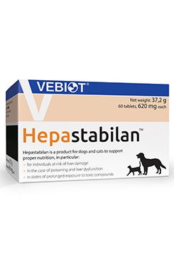 Výživový doplnok pre psov a mačky vyvinutý v spolupráci s veterinármi pre prirodzenú podporu správnej funkcie pečene vášho maznáčika. Testované v Univerzitnom centre veterinárnej medicíny v Poznani - pre vašu istotu. vysoká absorpcia podporuje fyziologické procesy prebiehajúce v pečeni obsahuje prírodné zložky, ktoré podporujú funkciu pečene odporúčané pre psov a mačky, ktoré potrebujú podporu pečene ľahko sa bez chuti. Prečo potrebujú pečeň vášho maznáčika podporu? Pečeň je orgán, ktorý v tele psov a mačiek plní dôležité funkcie – sú okrem iného zodpovedné za metabolizmus a čistenie tela od toxínov. Ich stav môžu ovplyvniť každodenné výzvy, nevhodná strava alebo vek. HEPASTABILAN bol vytvorený na podporu fyziologických funkcií pečene a ich udržanie v dobrej kondícii. Ako funguje Hepastabilan? Sila prípravku HEPASTABILAN spočíva v synergickom pôsobení presne vybraných zložiek, ktoré: podporujú fyziologické procesy regenerácie pečene, prispievajú k ochrane pečeňových buniek, podporujú fyziologické funkcie pečene, majú pozitívny vplyv na procesy metabolizmu látok a odstraňovanie produktov metabolizmu, pečeň,prispievajú k ochrane pečeňových buniek pred oxidačným stresom Kedy použiť Hepastabilan?tvrdo medicíny Univerzity biologických vied v Poznani *dôverujú mu odborníci - vyvinuté v spolupráci s veterinármi a odporúčané v ordináciách lekárovbezpečnosť použitia - bezpečné a vhodné pre dlhodobé užívanie u psov a mačiekvysoká absorpcia - obsahuje aktívne zložky vo forme ľahko dostupné pre telo zvieraťovhodné pre zvieratá - tablety s neutrálne rozpustiť vo vode Zloženie: kvasinkové produkty 15,4%, rastlinný komplex: surový lecitín (prášok) 3,05%, semená pestreca mariánskeho (extrakt) 1,31%, sodná soľ kroskarmelózy 2,62%, fosforečnan dvojvápenatý 3,9 1%.Doplnkové látky:Technologické doplnkové látky: mikrokryštalická celulóza 435 g/kg, koloidný oxid kremičitý 9 g/kg (protispekavá látka).Nutričné doplnkové látky (g/kg): vitamín E 92,3 g/kg (92 300 IU/kg), gly g/kg.Analytické zložky: surová bielkovina 16,74%, surové vlákno 26,56%, surový tuk 12,52%, surový popol 14,85%. Ako používať Hepastabilan? Spôsob podania: Tabletu HEPASTABILAN možno zvieraťu podať celú priamo do papule alebo skrytú, napríklad v maškrte. Môžete ju tiež rozdrviť a zmiešať s obľúbeným krmivom alebo vodou. Balenie obsahuje 60 štvordielnych tabliet. Tablety sú bez chuti a zápachu, ľahko sa rozpúšťajú a ľahko sa podávajú aj tým najnáročnejším maznáčikom. Denná dávka Telesná hmotnosť psa/mačky 1/2 tablety 1 1 tableta 3 kg / 5 kg 1 1/2 tablety 6 kg / 10 kg 2 tablety 11 kg / 15 kg 2 1/2 tablety 16 kg / 20 kg 3 tablety > 20 kg