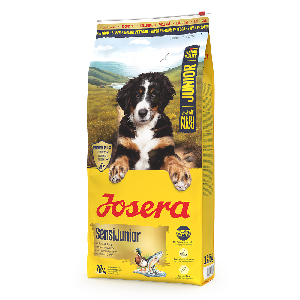 A naše krmivo'''Josera SensiJunior''' s lososom, kačicou a ryžou ich dokonale spĺňa! Šetrné krmivo pre šteňatá s bezlepkovou receptúrou pre stredné a veľké plemená je bohaté na bielkoviny a vďaka vyváženému pomeru vápnika a fosforu, vitamínu C, mangánu a medi podporuje zdravé kosti a optimálny vývoj. Toto ľahko stráviteľné krmivo je ideálne aj pre mladých psov s citlivým zažívaním: šupky psyllia podporujú črevnú flóru a vyvážený komplex vlákniny reguluje trávenie. S novým dizajnom sa k osvedčenej receptúre pridáva aj'''IMMUNE PLUS'''. Tento komplex podporuje u vášho mladého štvornohého kamaráta neporušený imunitný systém. Ideálna šetrná strava pre veľké a citlivé šteňatá v období rastu!
