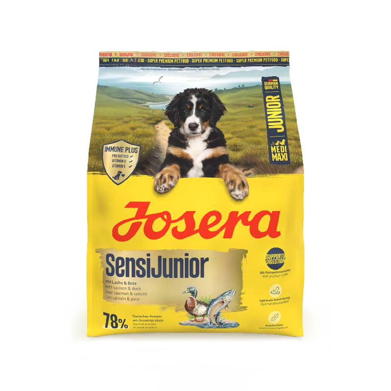 A naše krmivo'''Josera SensiJunior''' s lososom, kačicou a ryžou ich dokonale spĺňa! Šetrné krmivo pre šteňatá s bezlepkovou receptúrou pre stredné a veľké plemená je bohaté na bielkoviny a vďaka vyváženému pomeru vápnika a fosforu, vitamínu C, mangánu a medi podporuje zdravé kosti a optimálny vývoj. Toto ľahko stráviteľné krmivo je ideálne aj pre mladých psov s citlivým zažívaním: šupky psyllia podporujú črevnú flóru a vyvážený komplex vlákniny reguluje trávenie. S novým dizajnom sa k osvedčenej receptúre pridáva aj'''IMMUNE PLUS'''. Tento komplex podporuje u vášho mladého štvornohého kamaráta neporušený imunitný systém. Ideálna šetrná strava pre veľké a citlivé šteňatá v období rastu!