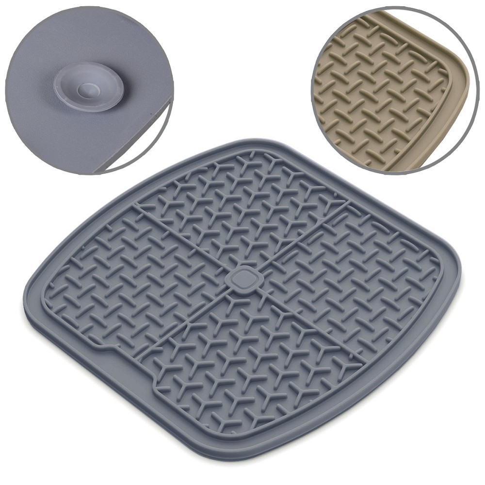 Prispieva k čisteniu jazyka a zdravej ústnej hygiene. Vhodné kombinovať vlhkým krmivom ako napríklad konzervy, paštéty a iné. Na spodnej strane podložky je 20 prísaviek na upevnenie k hladkým povrchom. Materiál je TPE (Termoplastický elastomér) Parametre: 20 x 20 x 1 cm MIX Fareb (šedomodrá a béžová)