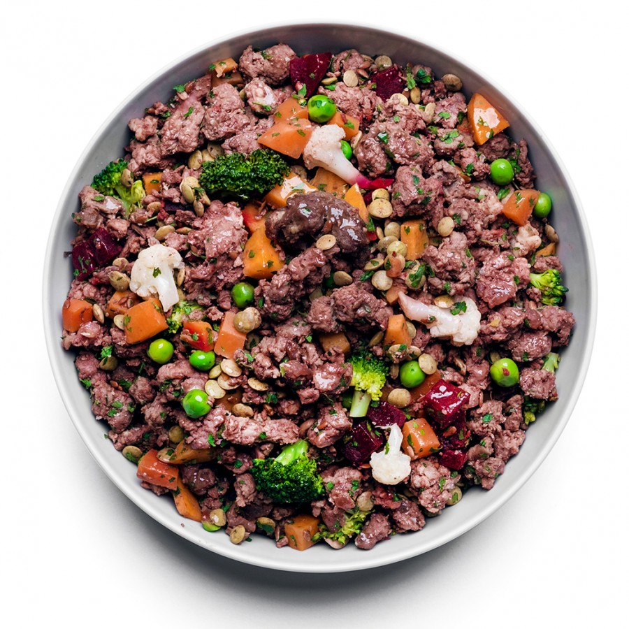 ZLOŽENIE: 60% = Hovädzí krk (46,2%) + hovädzie srdce (9%) + hovädzia pečeň (4,8%) 39% = Mrkva, sladké zemiaky, zelená šošovka, červená repa, hrášok, karfiol a brokolica1 ANALYTICKÉ ZLOŽKY: Hrubý proteín: 15% (168,7 g/kg) Hrubé oleje a tuky: 12% (88,3 g/kg) Hrubá vláknina: 2% (6) 1% (11,8 g/kg) Fosfor: 1,3 g/kg Vlhkosť: 88%