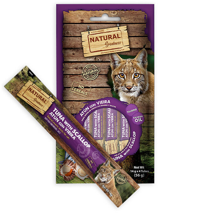 Parametre produktu Natural Greatness Creamy DHA BRAIN, funkční pamlsek - tuňák, hřebenatka, 4 x 14 g
