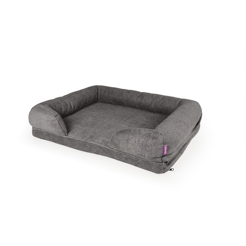 Kvalitná ortopedická pohovka navrhnutá pre maximálne pohodlie psov všetkých veľkostí. Kombinácia pamäťovej peny a klasickej peny poskytuje ideálnu podporu kĺbom a chrbtici, čo ocenia najmä staršie psy alebo jedinci s pohybovými problémami. Vďaka odnímateľnému poťahu je údržba jednoduchá a praktická. Povrch: tmavo šedá pohovková tkanina Spodná časť: čierna protišmyková tkanina pre stabilitu Výplň: biele netkané vložky s polyesterovými vláknami pre opierku, základňa z 2 cm Zipsy: na zadnej strane a spodnej časti Poťah je kompletne snímateľný a prateľný v práčke Rozmer: 66 × 53 × 15 cm Balenie: 4 ks / kartón Poznámka: nie je vákuovo balené