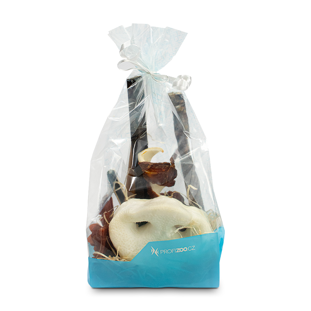 Obdarujte Vašeho mazlíčka jedinečným dárkem plným chutí a neodolatelných vůní. Balíček se spoustou vynikajících dobrot, kterými mu uděláte radost a zároveň si skvěle pochutná. Jedlý dárek vždy potěší a nadšení z rozbalování a ochutnávání Vaším psem bude jistě zábavou i pro Vás. PROFIZOO Vánoční balíček pro psy